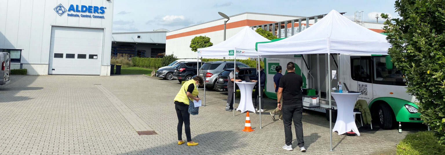 #hier wird geimpft – unter diesem Hashtag hat sich das Corona-Impfmobil einen Werktag lang auf dem Firmengelände von ALDERS electronic platziert. IHK Mittlerer Niederrhein, Unternehmerschaft Niederrhein und AOK Rheinland/Hamburg hatten die Aktion im Kempener Gewerbegebiet „Am Selder“ initiiert. Mit der Initiative wollen die drei Organisationen die Impfquote in den Unternehmen erhöhen. „Eine Kampagne, die wir sehr gerne unterstützen, deshalb haben wir unseren Parkplatz zur Verfügung gestellt“, sagt Geschäftsführer Martin Alders. ALDERS selbst hat bereits im Juli aus eigener Initiative zu einer Betriebsimpfung eingeladen, seitdem sind alle Mitarbeitenden des Elektronik-Unternehmens durchgeimpft.